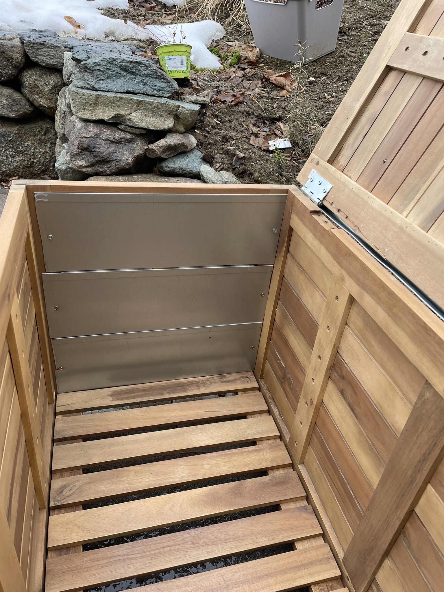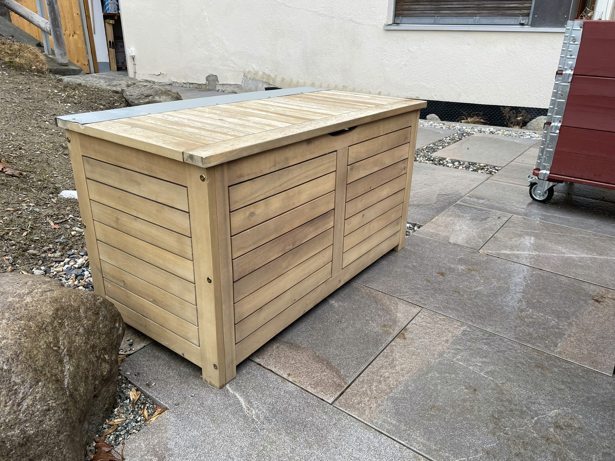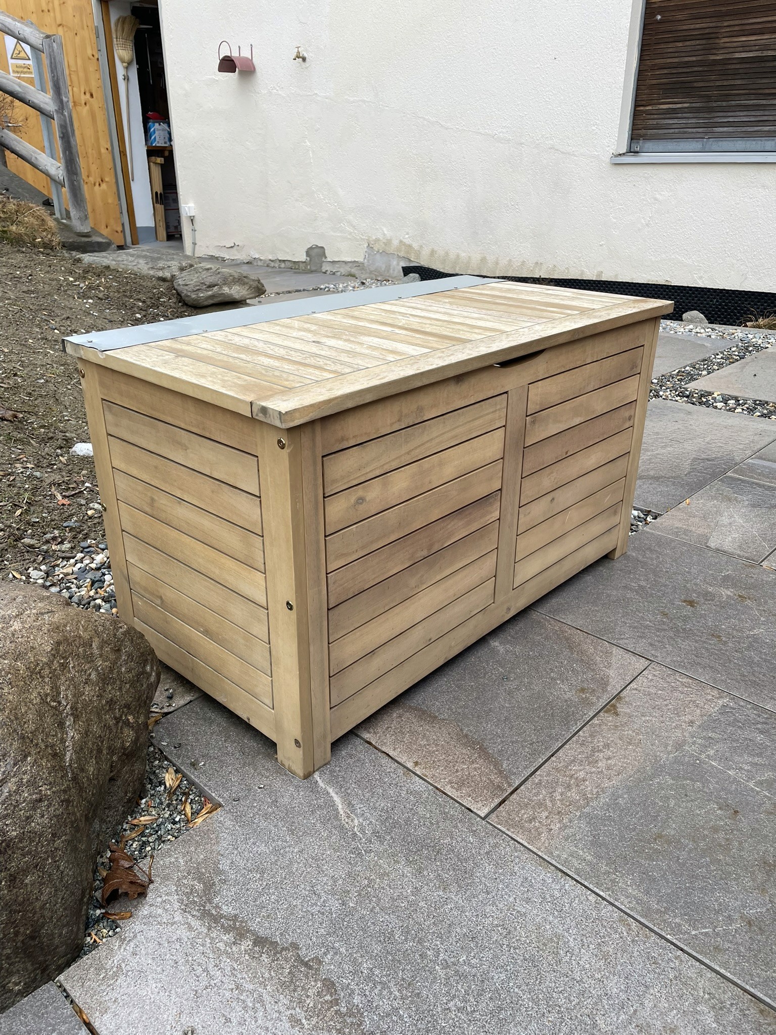 Nachdem ich eine Outdoor-taugliche Kiste in der entsprechenden Grösse gefunden habe, wurde ich schon bald enttäuscht. Schon nach nur wenigen Monaten im Einsatz, brach das Holz ab, dort wo das Scharnier befestigt war. Es war auch eher ungünstig platziert: nur an den Stirnseiten der Bretter. Es war also eigentlich nicht verwunderlich, dass es nicht lange hielt. Nur leider kann man solche Details bei online Käufen nicht immer sehen.