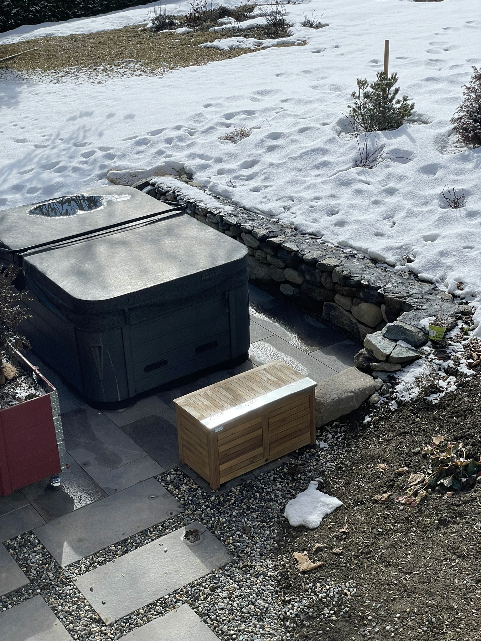 Unseren Whirlpool im Garten kann man auch nutzen, wenn es regnet oder schneit. Oder gerade dann…! Es ist herrlich, im Pool im warmen Wasser zu sitzen, während es um einen rum schneielet… Damit die Kleider trocken bleiben unterdessen, haben wir eine Kiste angeschafft, wo die Sachen während dem Baden trocken bleiben.